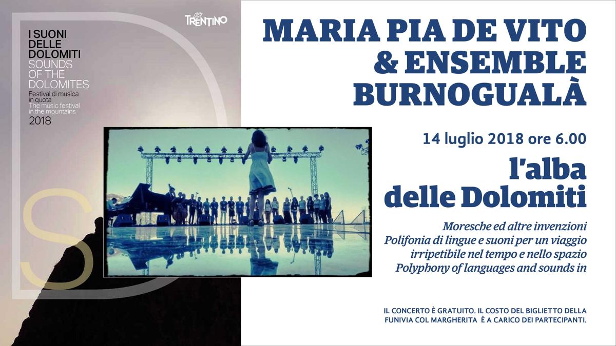 L'edizione 2018 dell'Alba delle Dolomiti, anche quest'anno appuntamento clou della rassegna I Suoni delle Dolomiti, giunta alla sua 24esima edizione, avrà luogo sabato 14 luglio alle ore 6,00 sempre nella spettacolare cornice naturale del Col Margherita (2.514 m), con le voci dell’Ensemble Burnogualà che, sotto la guida della cantante e compositrice Maria Pia Devito, affronteranno in chiave jazzistica le ‘Moresche’ di Orlando di Lasso - cicli carnevaleschi, parodie, danze - portando il pubblico in storie di schiavi e liberti, tra suoni di mondi lontani, imitazioni di strumenti e versi di animali.