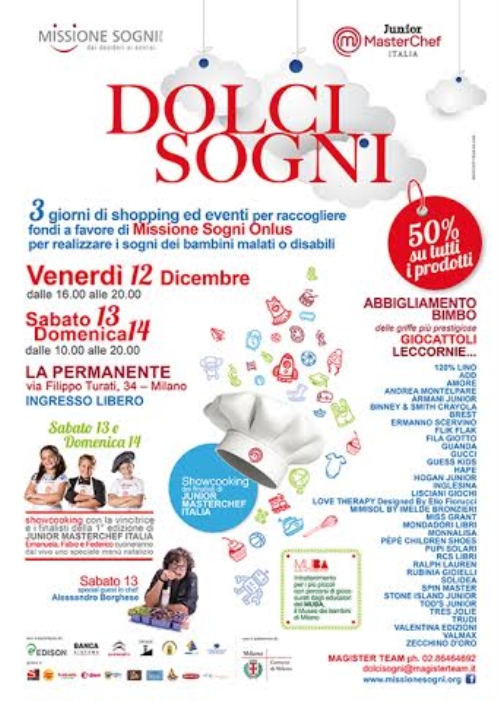 Da venerdì 12 fino a domenica 14 dicembre, al Palazzo della Permanente di Milano (Via Filippo Turati, 34), Dolci Sogni, organizzato in collaborazione con prestigiosi marchi di abbigliamento, giocattoli, accessori per bambini e prelibatezze natalizie, prevede la straordinaria partecipazione dei finalisti del talent show Junior MasterChef Italia, che tornerà in onda in esclusiva su Sky Uno HD (canale 108 di Sky) a marzo con la seconda stagione.