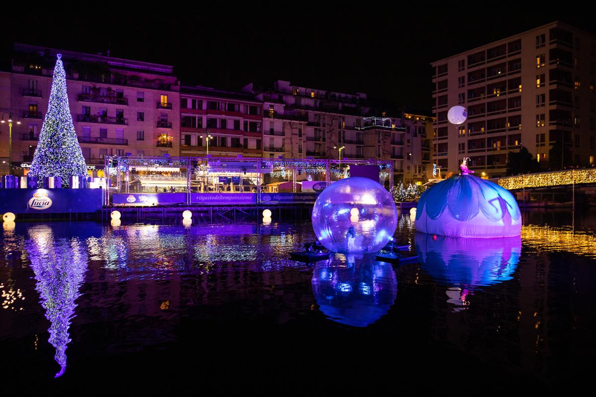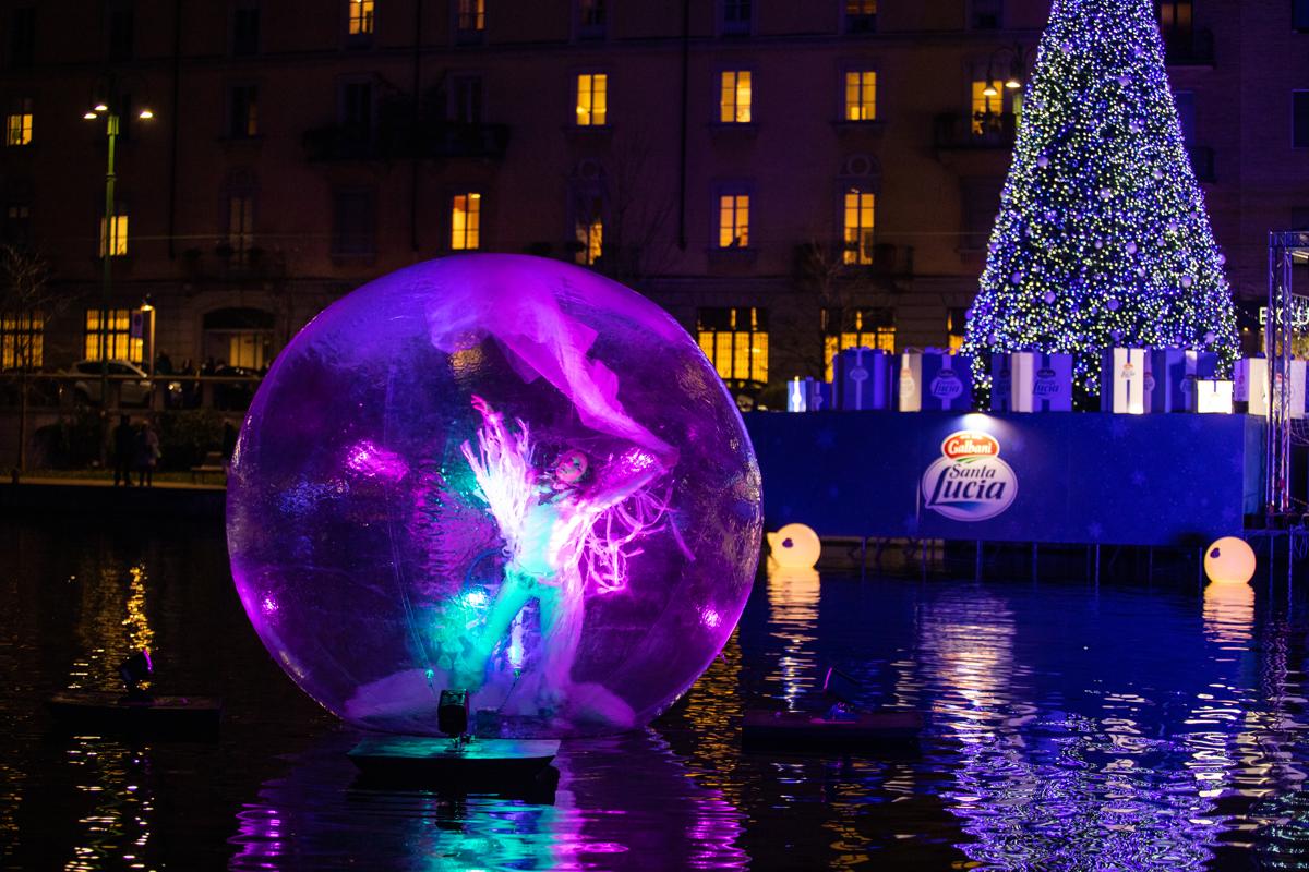 La serata è stata aperta simbolicamente, con un gruppo di bambini che ha scritto il proprio desiderio su alcuni palloncini, poi liberati in cielo dalla Slitta di Babbo Natale. A seguire, ha preso vita uno show unico nel suo genere con l’esibizione di una performer che dall’interno di una grande bolla galleggiante sprigionerà la sua energia sospesa tra le acque. La celebrazione è culminata con l’esibizione della Dama Bianca che ha rappresentato l’arrivo di Santa Lucia; una figura magica, immaginaria, ha stupito il pubblico con la sua danza, il suo canto e gli effetti speciali.