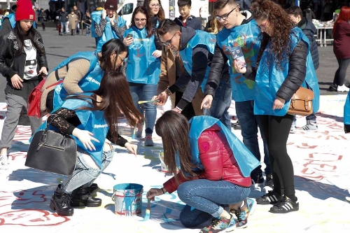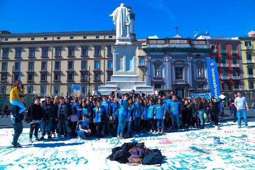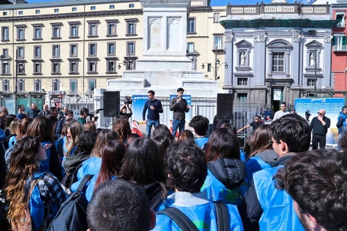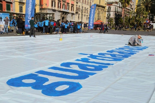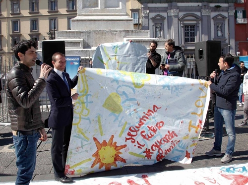 In Piazza Dante, gli studenti di sei istituti napoletani insieme allo street artist Ivan hanno composto una 'pagina bianca' di poesia per sensibilizzare i cittadini all'uso responsabile del cellulare alla guida. Testimonial d'eccezione, Gigi e Ross, conduttori della trasmissione Tv Made in Sud.