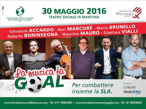Saranno il Maestro Salvatore Accardo e il suo violino, il Maestro Mario Brunello e il suo violoncello, Roberto Boninsegna, con Gianluca Vialli, Massimo Mauro, unico italiano che ha giocato con Platini, Zico e Maradona e Neri Marcorè con la sua partitura di satira e poesia, i protagonisti principali dell’evento-concerto 'La musica fa goal', che si terrà a Mantova al Teatro Sociale lunedì 30 maggio a partire dalle ore 20.00.