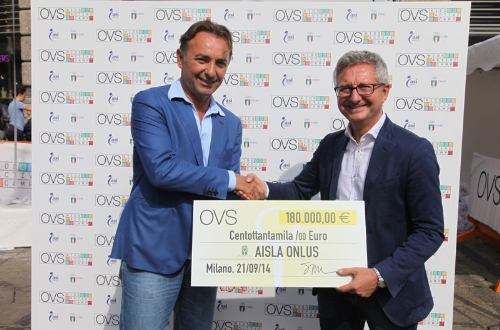 La consegna dei fondi all’Associazione Italiana Sclerosi Laterale Amiotrofica è avvenuta domenica 21 settembre alle 12 in Piazza Beccaria a Milano: Francesco Sama, direttore generale OVS, ha donato a nome di tuti i clienti l’assegno a Massimo Mauro, presidente Aisla. Alla cerimonia è intervenuto Antonio Rossi, Assessore allo Sport e Politiche per i giovani della Regione Lombardia.