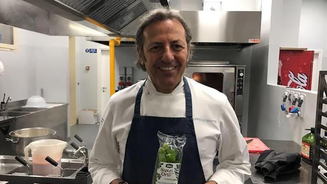 Il menù ha visto protagonisti i profumi e i sapori della cucina siciliana in cui affondano le radici 'dell’oste e cuoco', come ama definirsi lo stesso Chef La Mantia, riconosciuto a livello nazionale e per la prima volta a Cesena: insalatina tiepida di ricciola con centrifuga di carota e zenzero; sedanini con pesto di pistacchio, finocchietto, lime e mandorle tostate; pancia di maiale, crema di ceci, friggitelli e cous cous tostato; cannoli di ricotta e frutta candita.