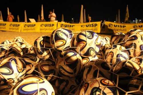 In spiaggia, una grande festa per la consegna a Uisp - Unione Italiana Sport di 3.000 palloni Brazuca, pallone ufficiale dei Mondiali FIFA in Brasile.
