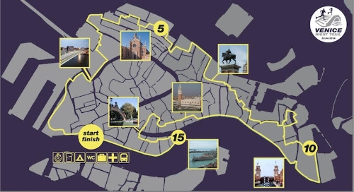 Il trail si addentrerà poi nelle zone più tipiche di Venezia, attraverserà campi e campielli di suggestiva bellezza, spingendosi fino a Sant'Elena e alla Biennale, per poi risalire fino a Piazza San Marco dove i partecipanti potranno godere del fascino di questa splendida piazza illuminata dalle luci della notte.