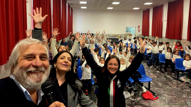 L’incontro è iniziato con un racconto emozionale sulle Olimpiadi, Paralimpiadi e sui Giochi di Milano Cortina 2026 a cura del team Education Gen26. A seguire Alfredo Accatino, Presidente di Filmmaster, e il suo team, hanno guidato studentesse e studenti alla scoperta della storia delle grandi Cerimonie, con video e testimonianze, da esperienze pregresse al dietro le quinte odierno. Infine, i bambini e le bambine hanno acceso simbolicamente la Torcia con i propri sogni, cantato l’Inno di Milano Cortina 2026 “Fino all’Alba”di Arisa, realizzato disegni sul tema Tregua e Pace che diventeranno cartoline per gli atleti, condiviso il motto Olimpico “Citius, Altius, Fortius – Communiter” in più lingue, e intonato insieme l’Inno di Mameli e l’Inno alla Gioia.