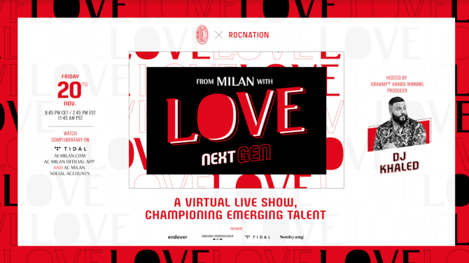 Dalla partnership tra AC Milan e Roc Nation, azienda specializzata nell'intrattenimento globale, nasce "From Milan with Love: Next Gen", l'evento digitale live per sostenere i talenti emergenti in tutto il mondo. L’evento si terrà venerdì 20 novembre alle 20:45 con esibizioni dal vivo caratterizzate dal potere aggregativo della musica insieme e dai valori chiave dello sport.