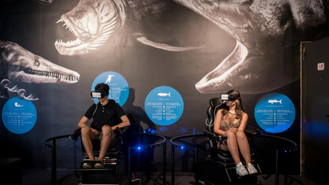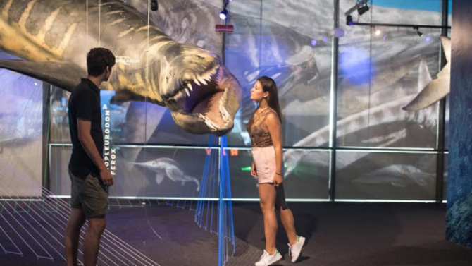 500 mq di spazio espositivo, 5 ricostruzioni in scala 1:1, 315 mq di illustrazioni a parete in scala 1:1, 3 esperienze multimediali, 1 area VR con 10 postazioni di Realtà Virtuale composte da sedute movimentate e Samsung Gear VR per un viaggio a 360° nel tempo e nello spazio. 180 secondi di video immersivo, consentono al visitatore di immergersi negli Oceani preistorici alla scoperta dei grandi predatori marini come Liopleurodon, Tylosaurus e Cryptoclidus.