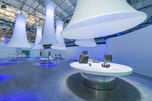 Dopo l’emozionante esperienza dell'installazione creativa, gli ospiti incontreranno la zona espositiva vera e propria, dove le superfici e i volumi si dilatano e la luce domina lo spazio. Qui morbidi e leggeri corpi conici sospesi nell’aria faranno da cornice ad ampie superfici circolari fluttuanti nello spazio che raccoglieranno le proposte dell’azienda, rivelandosi in una continua scoperta.