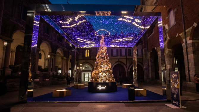 Ideata e progettata da Dentsu Creative, l’installazione di 100 metri quadrati si trova nel pieno centro cittadino, in Piazza dei Mercanti, composta da un grande Albero centrale di oltre 6 metri, sopra cui si staglia un cielo costellato di luci e di frasi di augurio tratte dai cartigli natalizi di Baci che illuminano la volta stellata dell’istallazione e, attraverso di esse, ogni persona potrà sentirsi coinvolta come in un dolce abbraccio.