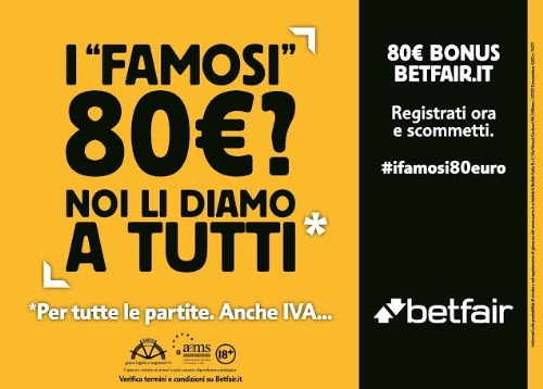 Come recita con un pizzico di ironia la campagna per il lancio della promozione, veicolata online sui canali social dell’azienda e con un’impattante campagna stampa sulla Gazzetta dello Sport, gli 80 euro su Betfair.it sono 'per tutte le partite, anche IVA… ', 'Qualsiasi sia il tuo reddito' e - come conclude deciso un terzo claim - 'E sì, abbiamo le coperture'.