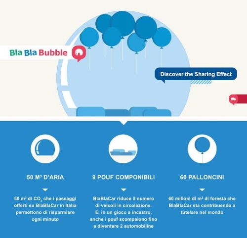 BlaBlaBubble - Discover the Sharing Effect è un’installazione-infografica che mostra l’impatto positivo di BlaBlaCar sulla mobilità e sull’ambiente attraverso la rappresentazione tangibile di tre dati e che prevede la partecipazione attiva dei visitatori e la loro interazione.