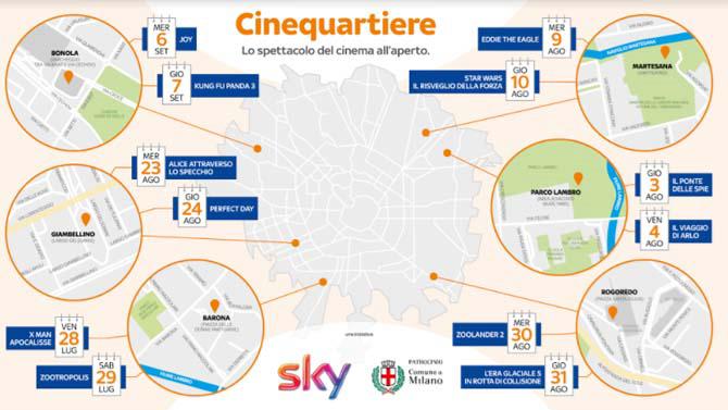 Cinequartiere, realizzata in collaborazione con il Comune di Milano, fa parte di una serie di attività rivolte a diversi luoghi della città che nei prossimi mesi coinvolgeranno i cittadini milanesi: come 'Estate allo Scalo', realizzato in collaborazione con il Comune di Milano e Confcommercio Milano allo scalo di Porta Genova, dove Sky propone un grande teatro dove poter assistere gratuitamente a una selezione dei programmi principali dell’offerta Sky e due aree sportive: un campo da calcetto 3 contro 3 e un campo di street basket sempre 3 contro 3 a disposizione gratuita di tutti (leggi la news a QUESTO LINK).