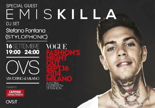 Come anticipato da e20express.it, il rapper italiano Emis Killa ha presenziato presso lo store OVS di Via Torino di Milano martedì 16 settembre in occasione della Vogue Fashion's Night Out, esibendosi live per tutti i fan accorsi (vedi notizia correlata a fondo pagina).
