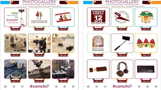 #ConChi? è il claim scelto per l'edizione 2016 e si accompagna al visual che ritrae una mano femminile che impugna un bastone da selfie. Al posto del cellulare, una tavoletta di cioccolato. L'invito, ovviamente, è a partecipare a Eurochocolate, immortalare in uno scatto cioccolatoso i momenti più coinvolgenti e, attraverso i social network, appunto condividerli con amici e followers.