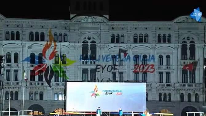 La cerimonia di apertura si è tenuta vista mare nel tardo pomeriggio di sabato 21 gennaio 2023 nella splendida Piazza Unità d’Italia a Trieste. Nonostante le condizioni atmosferiche svantaggiose, caratterizzate da una fortissima bora che ha creato disagi in tutto il territorio, i giochi si sono aperti con un dinamico video mapping show proiettato nel buio della piazza, visibile sia a terra che sul palazzo del Municipio della città e nei palazzi circostanti, con uno spettacolo volto a richiamare e valorizzare le bellezze naturali della regione e le tematiche legate alla sostenibilità.