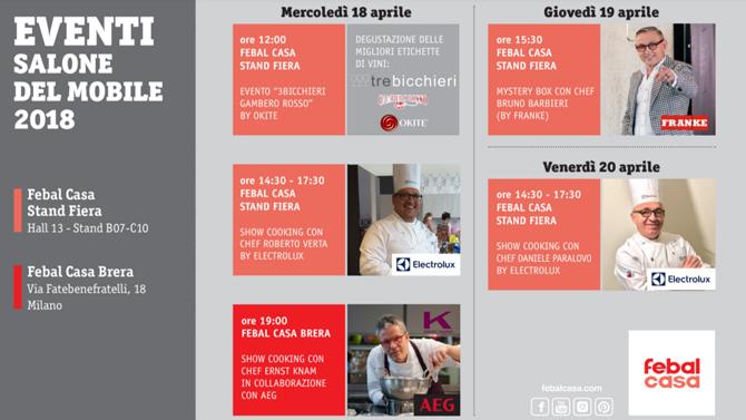 Numerosi sono gli eventi di Febal Casa in programma per il Salone del Mobile 2018 di Milano, a cominciare da iniziative di Show Cooking e molto altro. Protagonisti di questi incontri saranno alcuni tra i più rinomati chef del panorama italiano ed internazionale, che verranno accolti allo stand Febal Casa per cinque appuntamenti.