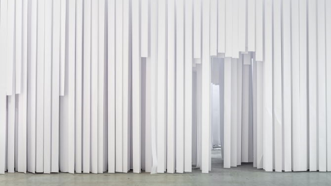 Elemento centrale dell’opera di Pettena è infatti il ruolo attivo del pubblico, che non si limita a guardare, ma diventa parte integrante del processo: l’intervento dei partecipanti contribuisce infatti a determinare la configurazione dello spazio e il significato stesso dell’esperienza, rendendo l’opera un evento collettivo, malleabile nel tempo. Di fronte alle lunghe strisce di carta appese al soffitto che riempiono gli spazi, i visitatori ritagliano il proprio percorso con le forbici, creando un’architettura temporanea e spontanea a misura d’uomo. Attraverso questo percorso mutevole e labirintico, disegnato all’interno di uno spazio total white, gli elementi architettonici si neutralizzano e il corpo si libera dai vincoli di dimensioni, prospettive e partizioni. Spogliato dei consueti punti di riferimento spaziali, il pubblico è invitato a immergersi in un ambiente puro, abbandonandosi alla scoperta di una nuova percezione sensoriale.