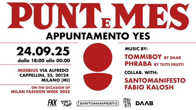 Durante l’evento saranno disponibili in esclusiva e in omaggio t-shirt con grafica di Fabio Kalosh prodotte da Unnatural e i poster artistici firmati Santomanifesto, entrambi dedicati a Punt e Mes in occasione della Fashion Week 2025.