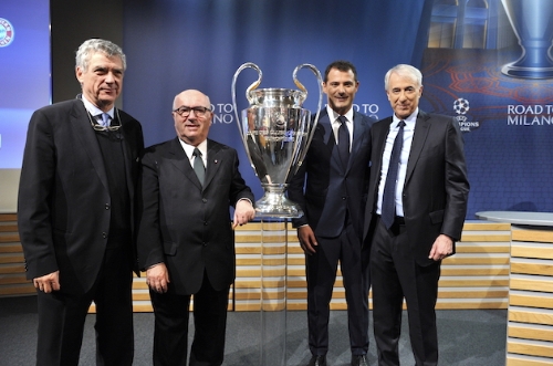 (FOTO: insieme al sindaco Giuliano Pisapia, il primo vicepresidente della Uefa Villar Llona, il presidente della Figc Carlo Tavecchio e l’ex calciatore Dejan Stankovic)