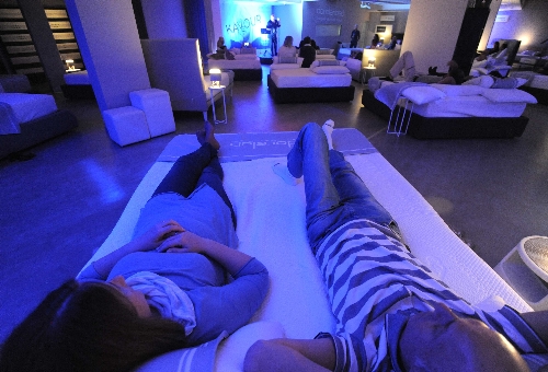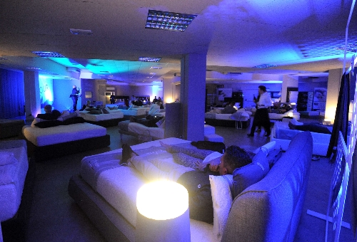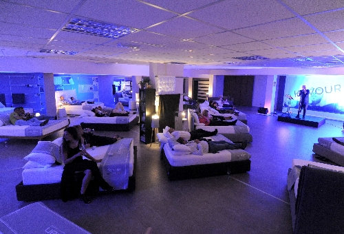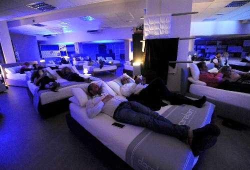 alle ore 20: il pubblico, divertito e sorpreso, si è accomodato sui 30 letti matrimoniali disposti a