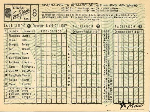 La famosa schedina Sisal, nata nel dopoguerra dall’idea di tre giornalisti sportivi, è oggi in esposizione alla mostra 'Il grande gioco dell’industria – 50+1 oggetti che hanno fatto la storia dell’impresa italiana' dedicata agli oggetti che raccontano la storia della cultura e della società italiana. Dal 9 al 31 ottobre presso lo Spazio Mostrami Factory@Folli50 a Milano.