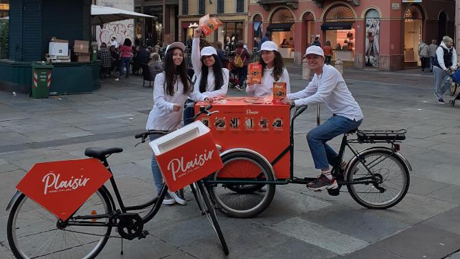 I prodotti verranno distribuiti in monoporzione da hostess e steward in divisa brandizzata a bordo di biciclette e cargobike. Saranno consegnati anche dei volantini promozionali con coupon sconto di 0,50€, da utilizzare per l’acquisto di 1 confezione di Plaisir nei punti vendita.