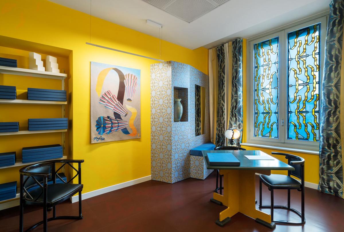 Il gusto unico di Pierre Marie per i colori e le fantasie colpirà i visitatori già all’entrata. Il lungo corridoio che porta agli uffici di Vogue Italia avrà le pareti ricoperte da un pattern originale appositamente realizzato dal designer creando un’esperienza coinvolgente, esagerando il ruolo degli ornamenti e delle decorazioni di uno spazio di passaggio molto spesso trascurato: l’ingresso. Nella Talent Room invece è stato creato uno spazio adatto all’ispirazione. Un luogo dove ogni idea è come un testimone che passa da una mente creativa all’altra, allietato dalla luminosità che le pareti dipinte di un giallo brillante e allegro donano all’ufficio. Per riuscirci Pierre Marie ha creato ciò che ora sembra essere la sua firma specifica ideata appositamente per la mostra: due nuovi arazzi ed una vetrata che filtra e colora la luce proveniente da Piazza Cadorna attraverso l’unica finestra della stanza. Con sottili riferimenti al Futurismo nei suoi nuovi arazzi o a Memphis nell’uso dello stampato laminato arricchito dal suo design, questa vivace mostra è anche una lettera d’amore da parte del giovane decoratore nei confronti di Milano.
