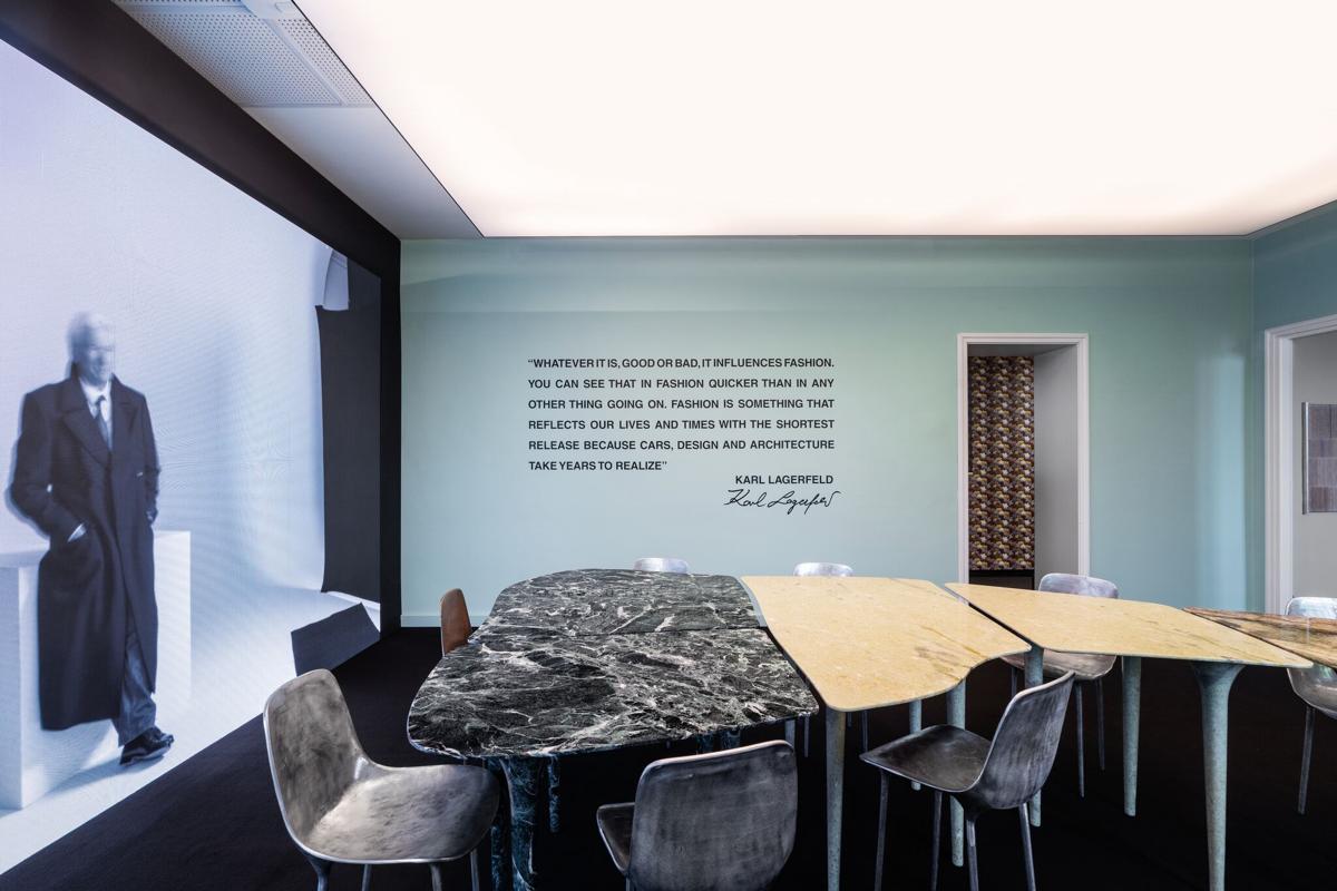"Ho voluto reinterpretare la sala riunione di Vogue Italia facendo entrare l'esterno, con la Piazza, il Castello e il suo Parco, nella stanza. Mi sono ispirato al famoso Desert de Retz, vicino a Paris. Un luogo che racconta una composizione di mondi e di culture diverse. Nella sala riunione che ho progettato ho usato una palette di verdi per creare un "dejeuner sur l'herbe" declinato attraverso il mio Tavolo Garda e i suoi marmi di verdi e di origini diversi. Le sedute sono le sedie ML 1.2 che ho voluto leggere nella loro fusione di allumino e di pietre lavica. La luce che illumina dal soffitto è un sistema modulare di Nemo che unifica l'ambiente. Sul pavimento 2 Escargots di Le Corbusier (edizione di Nemo) mi permettono di rendere omaggio al grande maestro del Modernismo. Su uno dei muri ho creato un orizzonte digitale che con un led wall proietta immagini tratte dall'universo Vogue. La sala riunione diventa l'incontro perfetto tra lo sguardo rigoroso del Modernismo e la libertà della mia visione di architetto."