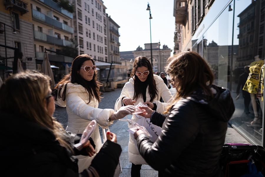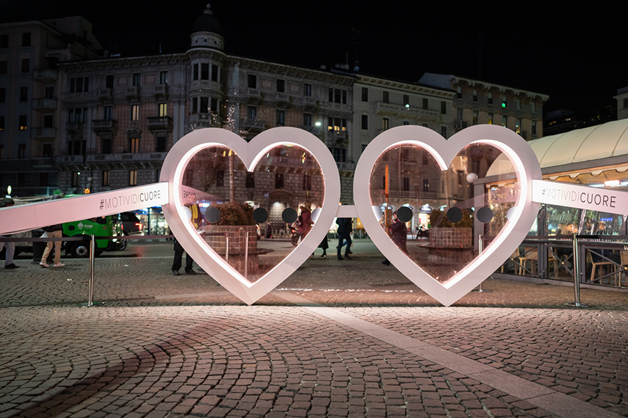 A Milano con un’operazione di guerrilla marketing sono stati distribuiti 5.000 paia di occhiali rosa a forma di cuore e in piazza XXV Aprile, piazza Argentina e corso Vittorio Emanuele, nel flagship store del brand, sono comparse delle installazioni fuori scala per tutti coloro che hanno voluto prendersi una pausa e guardare il mondo con il cuore.