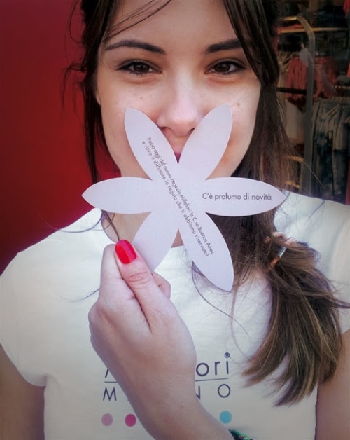 Le ragazze, vestite ciascuna coi colori delle aree olfattive e la scritta sulla schiena 'segui la tua essenza' hanno presidiato il Corso distribuendo centina di fiori di carta, appositamente disegnati e profumati con le fragranze Millefiori.