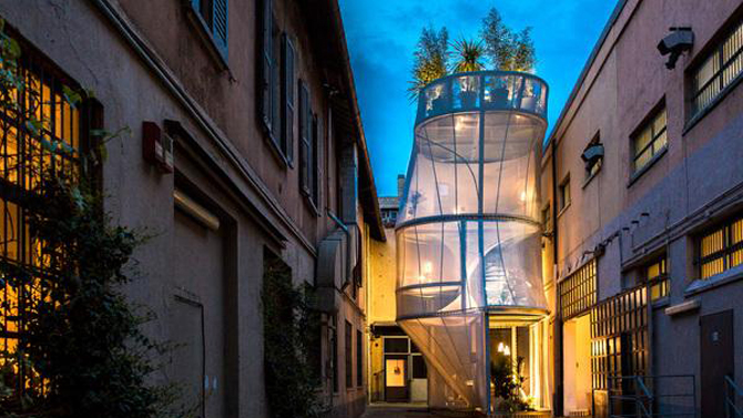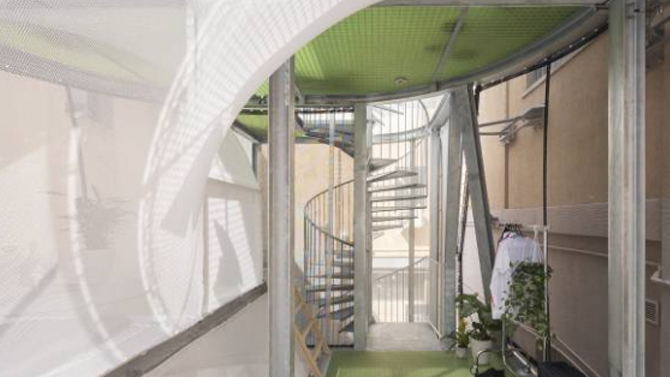 Al piano terra si trova un’area cucina: spazio dedicato alla socialità, dove incontrarsi ed essere in contatto con l’ambiente circostante. Questa zona è ideale per accogliere gli ospiti, passare del tempo con altre persone e stare insieme. I piani superiori sono, invece, divisi in diverse zone su tre livelli e offrono spazi accoglienti per riposare o per lavorare. Le stanze da letto, una costruzione intelligente per raccogliere l’acqua piovana e un giardino pensile completano la parte superiore dell’installazione. Le singole stanze sono separate da pareti in tessuto traslucido, tessuto che permette alle persone nella stanza accanto di intravvedere le sagome e i movimenti dei vicini, creando una sensazione di comunicazione e continuità tra gli spazi, senza però dover rinunciare alle proprie necessità di riservatezza all’occorrenza.