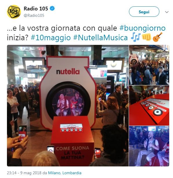 #NutellaMusica alla stazione di Milano Cadorna è stato solo il primo passo di un progetto articolato in diverse fasi. Proseguendo nella ricerca della musica ideale per cominciare la giornata con il piede giusto, nel corso delle prossime settimane gli ascoltatori di Radio 105 verranno invitati a scegliere il proprio «disco perfetto». Scopriremo così quali sono i brani maggiormente richiesti per il momento della colazione.