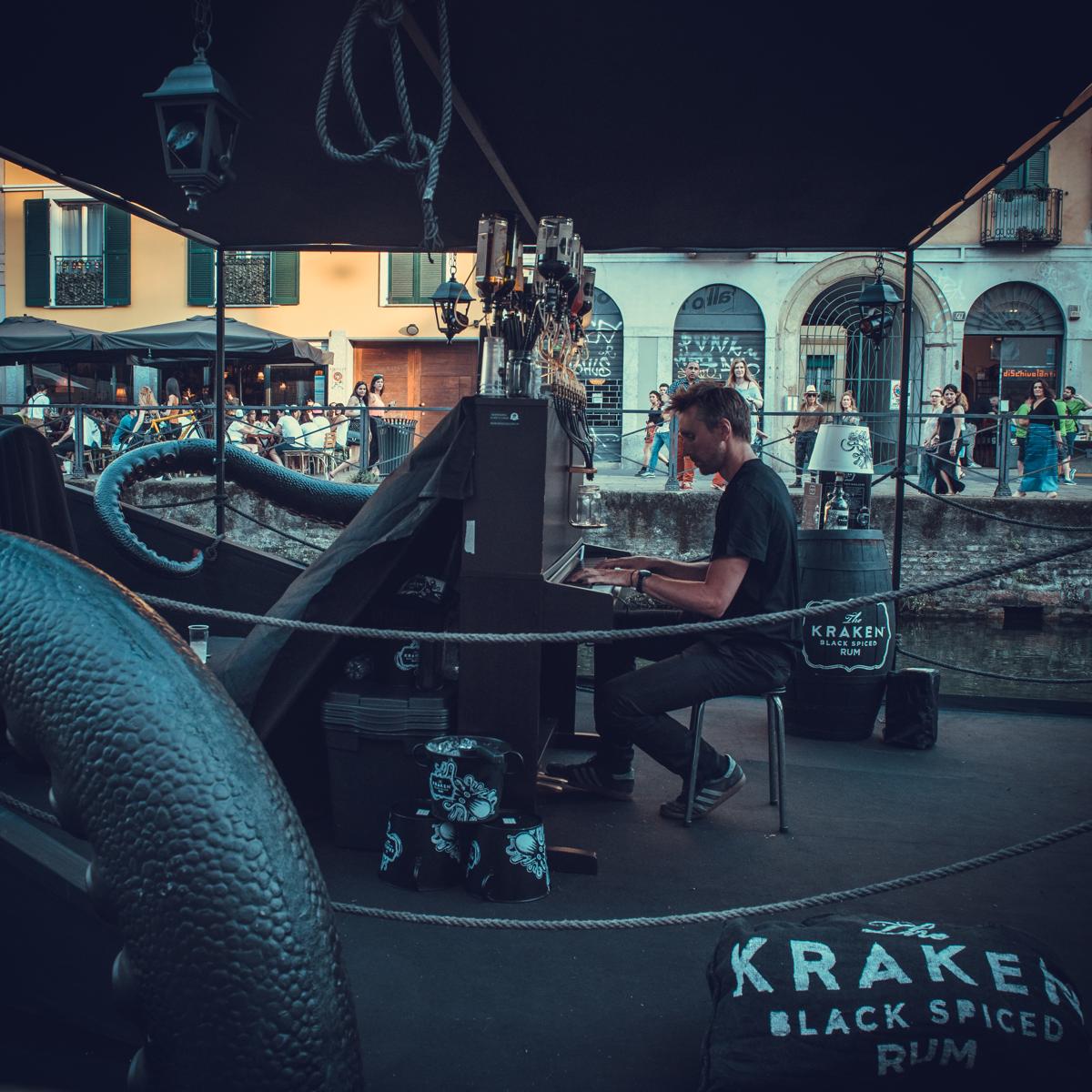 La chiatta ha sostato davanti ai locali partner dove i consumatori sono stati coinvolti in attività di engagement tra cui Le Pianocktail, ovvero l’esclusiva possibilità di assaporare tre diversi cocktail a base di The Kraken Rum preparato da un particolare pianoforte, installato sull’imbarcazione. Alla pressione di ogni tasto, corrispondeva il rilascio di un ingrediente del cocktail scelto.