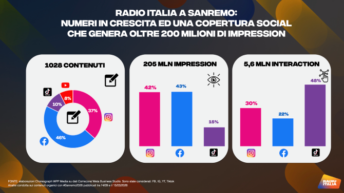 Radio Italia conferma il successo della sua attività editoriale, digital e social a Sanremo 2026 svolta negli studi “Fuori Sanremo Italiana Assicurazioni”. Un impegno ulteriormente potenziato rispetto a quello delle edizioni precedenti, che ha prodotto i seguenti risultati: oltre 200 milioni di impression e 5,6 milioni di interaction totali con i profili Instagram, TikTok, Facebook e Youtube di Radio Italia.