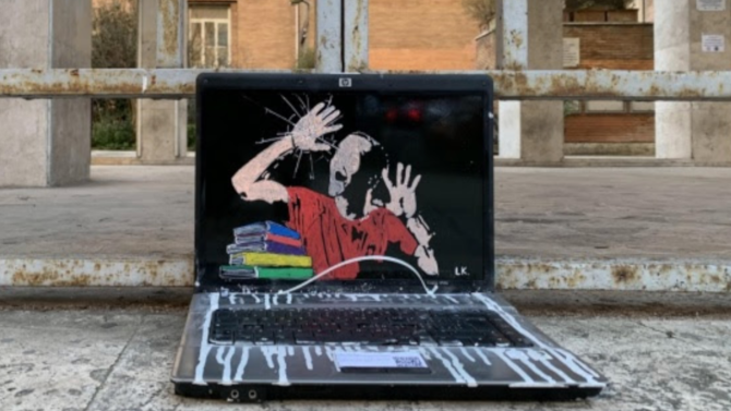 Lunedì 18 gennaio davanti al Liceo Giulio Cesare, in corso Trieste a Roma, è apparsa una nuova opera di Laika dal titolo “2021: IN PRESENZA, IN SICUREZZA”. Si tratta di un computer portatile sul quale è disegnato uno studente che tenta di uscire dallo schermo. L’artista ha voluto rappresentare il tema della Didattica a Distanza proprio nel giorno in cui riprendono parzialmente le lezioni in presenza.