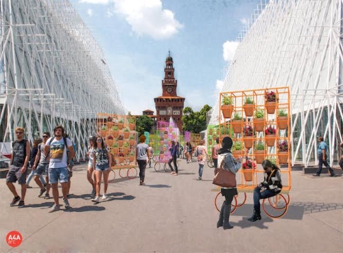 È un giardino pubblico su ruote che appare nella piazza di Expo Gate all’alba di lunedì 13 aprile e, come in una performance, si completa di piante e fiori nel corso della mattinata.