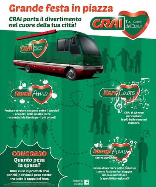 Un Tour che coinvolgerà grandi e piccini divertendoli con giochi, canti e concorsi e che avrà anche l’obiettivo di far scoprire il mondo Crai, i suoi prodotti e i suoi servizi.