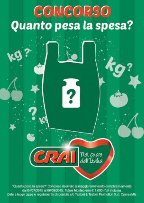 Nella piazza sarà allestito lo stand Crai presso il quale sarà ben visibile una teca con alcuni prodotti Crai. Tutti coloro che desidereranno partecipare al concorso dovranno ritirare la cartolina presso lo stand e compilarla con i propri dati anagrafici e con il peso presunto della spesa. Ben 1000 euro in prodotti Crai per chi indovinerà il peso esatto.