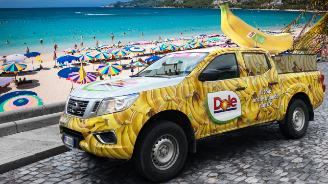 Alle iniziative on the beach, organizzate sulla base di un predefinito palinsesto di animazione giornaliero, che si svolgeranno lungo il tratto del bagnasciuga e all’interno dei lidi, si affiancherà un presidio statico sul lungomare, accessibile liberamente da tutti, vacanzieri e non. Grande protagonista di quest’area sarà il pick up brandizzato Dole Italia, altamente visibile e riconoscibile attraverso la Banana Premium Dole gigante posizionata sul top del mezzo, che funzionerà come principale elemento di attrazione per tutti i passanti e bagnanti. Il pick up di Dole Italia identificherà anche il punto privilegiato per le iscrizioni alle attività e la distribuzione di sample di prodotto e gadget, specificatamente pensati per il mare (materassini, cappellini, tshirt, teli mari e tanto altro ancora).