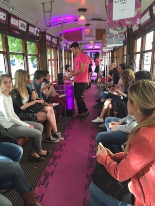 Un mezzo di trasporto completamente fucsia trasformato per due giorni - il 22 e il 23 aprile negli orari di massima affluenza di pubblico - anche in un mezzo di divertimento, moda e socialità dove, a tutti coloro che sono saliti a bordo, sono stati offerti free drink, gadget fucsia, sconti sulla nuova collezione e tanta musica.