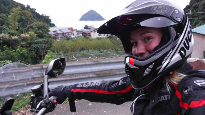 Ma Jessica, con la sua esile corporatura (è alta appena un metro e 62 centimetri), ha deciso di continuare il suo viaggio in sella alla Multistrada 1200 Enduro ed è stata appena rallentata dal tifone nella sua attraversata del Sol Levante.