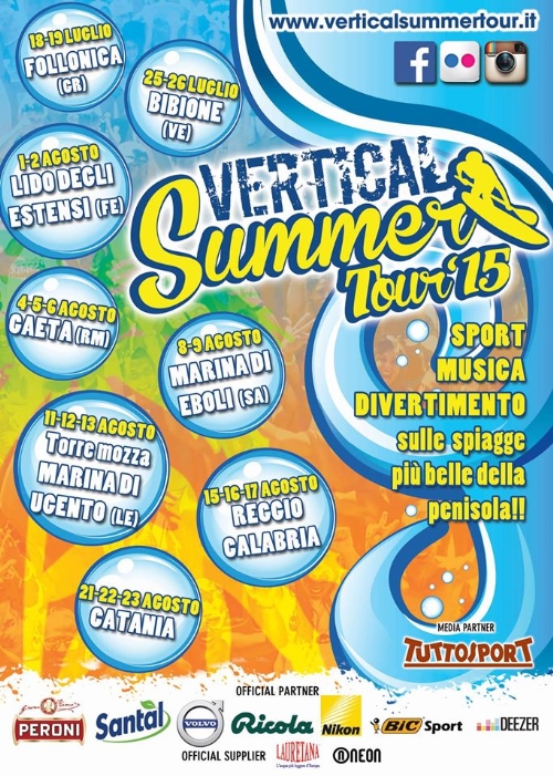 In tutto otto tappe in 35 giorni che toccheranno altrettante regioni: dopo il via in Toscana nel terzo weekend di luglio, la settimana successiva il Vertical Summer Tour 2015 toccherà Bibione, al confine tra Veneto e Friuli Venezia Giulia. E poi, senza soluzione di sosta, Lido degli Estensi, Gaeta, Marina di Eboli, Marina di Ugento, Reggio Calabria e Catania.