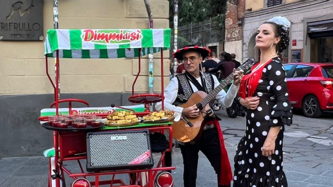 Un risció brandizzato DimmidiSì percorre le vie cittadine offrendo assaggi delle tortillas fresche, accompagnate da fresca sangria preparata secondo la ricetta originale dello chef Alessandro Ferrari.