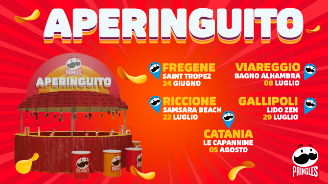 Riparte il tour estivo di Pringles, che animerà il momento più amato dagli italiani, l’aperitivo, su cinque delle spiagge più iconiche dell’estate italiana. Il brand apre il suo chiringuito esclusivo, l’Aperinguito, co-gestito dalla mascotte ‘Mr P’ e i talent più amati del momento, che coinvolgeranno i bagnanti in giochi sorprendenti, attività divertenti ed esperienze social.