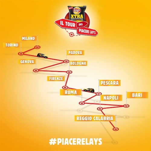 'Il tour del Piacere, Lay’s', che prende il nome dal claim che accompagna il lancio nel mercato italiano del marchio di patatine più venduto al mondo, è affiancato da importanti partner: oltre al co-marketing con Suzuki, in ogni tappa del tour sarà possibile seguire gli spostamenti del team Lay’s su Cityglance, la nuova social app metropolitana che permette, tramite un sistema di check-in, di abilitare una bacheca geolocalizzata sulla quale gli utenti possono condividere i propri pensieri e che comunicherà, in tempo reale, la posizione del team Lay’s in città.