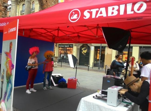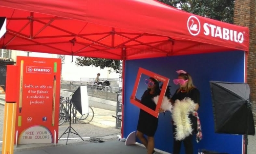 Saranno coinvolte cinque hostess per quest’operazione: due saranno impegnate nel distribuire i flyers, altre due presidieranno l’ingresso e una sarà all’interno del punto vendita per scattare una foto con una Polaroid ai ragazzi interessati. La foto potrà essere personalizzata utilizzando uno sticker su cui scrivere con Stabilo point 88 un proprio messaggio.