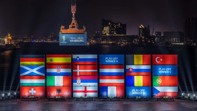 Amburgo ha ospitato nel porto il sorteggio della fase a gironi di UEFA EURO 2024 con un'enorme installazione di container