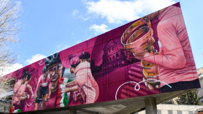 Il murales sarà dominato dall’immagine di un ciclista in Maglia Rosa, sostenuto e incoraggiato da un gruppo di tifosi mentre sfida, con tutta la sua energia, la forza del vento contrario. Sullo sfondo l’immagine del Colosseo, icona della Città Eterna, che a fine maggio accoglierà l’ultima tappa della 106^ edizione del Giro d’Italia.